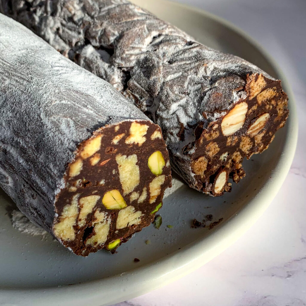 A csokiszalámi vagy kekszszalámi eddig teljesen kimaradt az életemből. Valahogy sosem mozgattak meg különösebben az ilyen sütésmentes nasik, de az utóbbi időben annyiszor jött velem szembe, hogy muszáj volt elkészítenem a saját verziómat is. Persze, akkor már nem akartam elaprózni a dolgot, így rögtön kétféle verzióban készült.